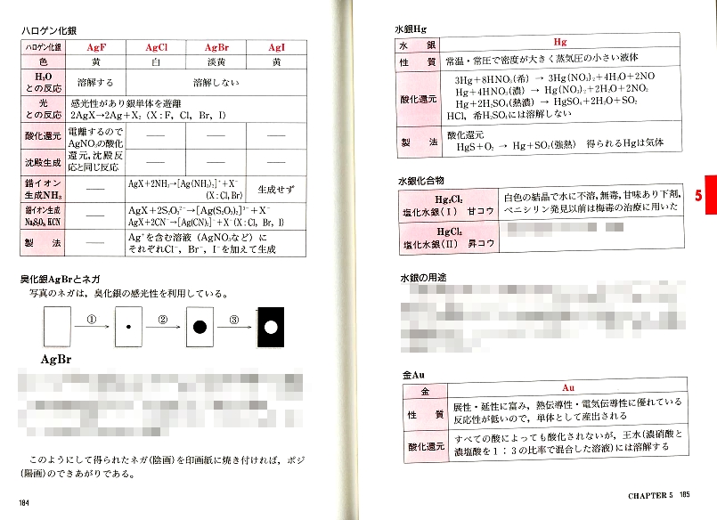 3つめに P.186, 187。コレは絶対見ておきたいページ ですね。無機化学の最後の砦といえば、そう、元素の分離です。HCl 等を加えていって、何の元素が入っているかを当てる問題。試薬と沈殿の性質アルゴリズムがまとめられています。こういう分析の問題には苦労しましたが、こういったチャートがあると覚えやすいですね。